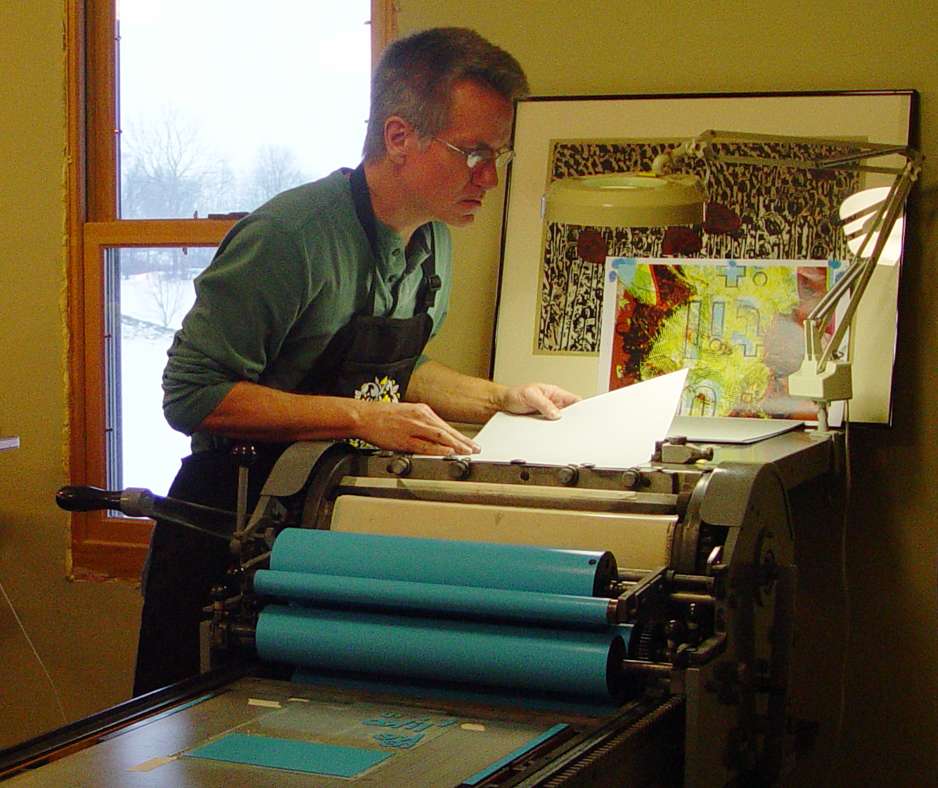 Kevin’s printmaking artistry includes letterpress, lithography, and woodcut—often mixing each medium and complementing them with screen printing. As an undergraduate fine art student at Indiana University at South Bend, he discovered that printmaking provided opportunities to combine his love for drawing with his enjoyment of demanding technical processes and commitment to beautiful craft. He continued his printmaking education by completing his M.F.A. in printmaking at the University of Illinois, with a special emphasis on lithography and intaglio. He has been exhibiting his artwork in national and international shows since 1977, and his prints can be found in private and public art collections. Kevin taught studio arts and graphic design for thirty-five years at several universities and has worked as a graphic designer since 1985 with several creative agencies and as a freelance graphic designer. Recently retired from teaching, Kevin is enjoying a renewed focus on his printmaking endeavors.
