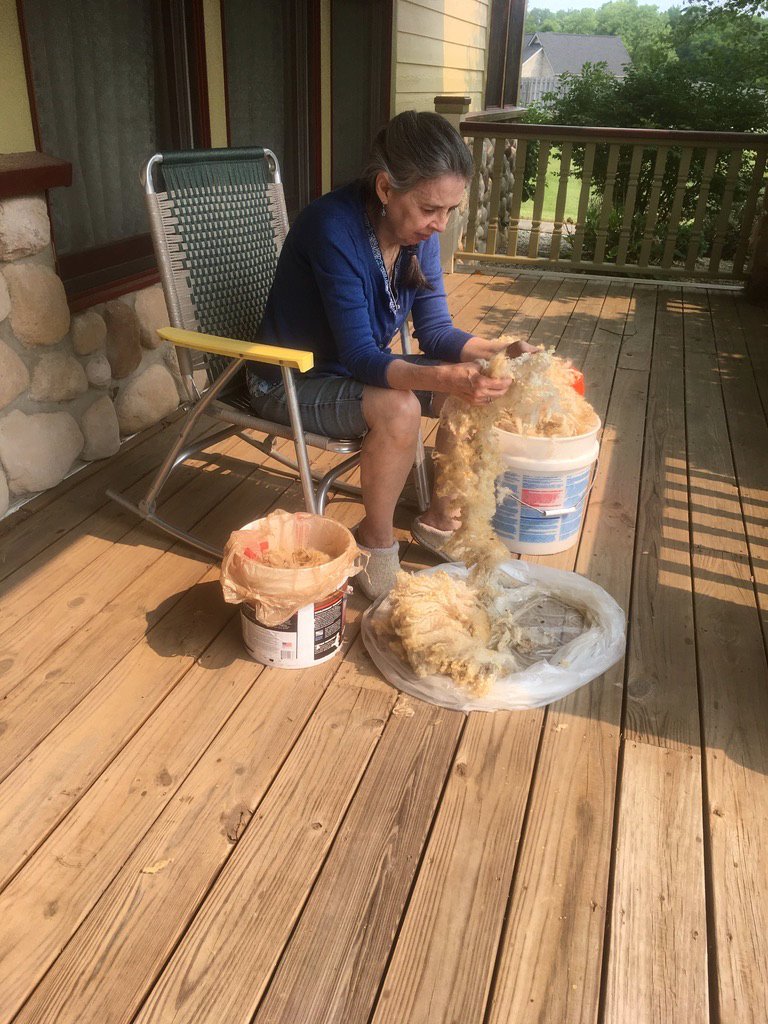 Mary’s repertoire of artistry includes crochet, knitting, fiber spinning, weaving, and sewing. Her attitude toward creative practice is shaped by her love for crafting beautiful functional textile products. For her, complex and time-consuming products are well worth the lifetime of service and beauty they add to everyday living. Nature inspires the designs, colors, and choices of materials for her products. Hand-spun wool, alpaca, and other natural fibers (even dog hair) offer beauty and practical comfort. Mary is committed to recycling whenever possible and gives new life to vintage yarn in her projects. Her recycling efforts extend to everyday materials like plastic grocery bags that are carefully crafted and appear to be natural straw handbags. Mary’s products available for sale on our site are “labors of love,” and she views them as worthy of her time and talents—and hopes you will find a place in your life for her fine products, too!